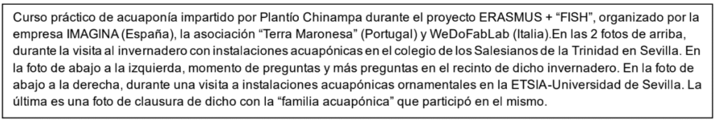 Posteriormente evolucionamos a cursos de segunda generación, con mucha mayor carga de prácticas, ya que muchos alumnos/as de los cursos anteriores nos demandaban talleres prácticos de montaje de instalaciones acuapónicas. Estos cursos se acompañaban del montaje, paso a paso, de hasta 5 ó 6 tipos de instalaciones acuapónicas con finalidad educativa y de autoconsumo familiar, así como las ya clásicas visitas a instalaciones acuapónicas en marcha con peces y plantas, donde aprovechábamos para explicar las rutinas de funcionamiento y