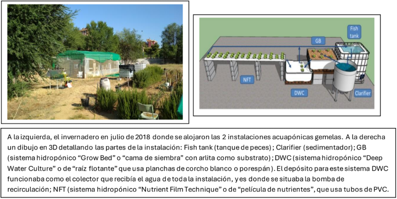 Una de las instalaciones se mantuvo en condiciones acuapónicas (con peces y plantas) todo el año, mientras que la otra, en los meses de temperaturas bajas en Sevilla (entre diciembre de 2019 y febrero de 2020), se transformó en una instalación hidropónica con vermicompost (compost hecho con lombrices de tierra).