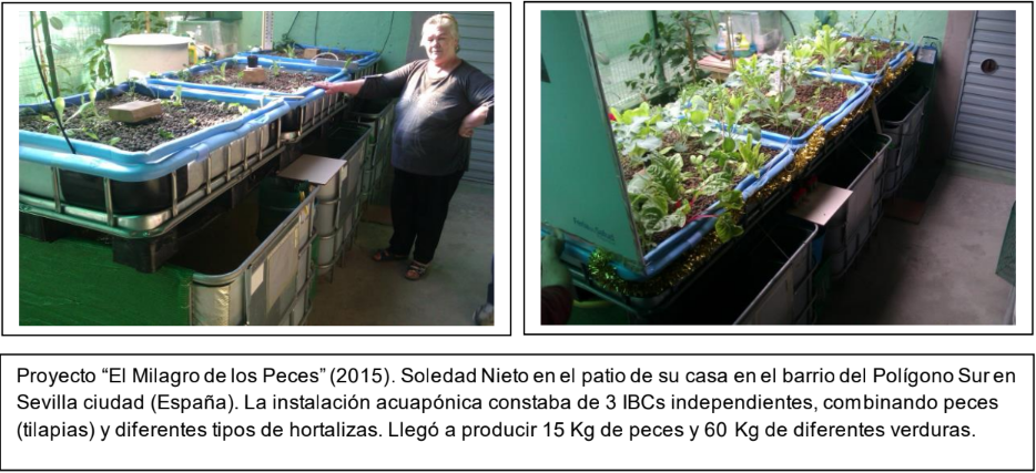 registramos toda la producción (de peces y plantas) y todos los costes de funcionamiento de las mismas (consumo de agua, de electricidad, de alimento para peces, etc…) durante 1 año. Cada instalación ocupaba una superficie útil de 7 m2 (en total 16 m2 incluyendo la superficie de pasillos para acceso y manejo de cada instalación) y un volumen de agua recirculante de 1.800 litros.