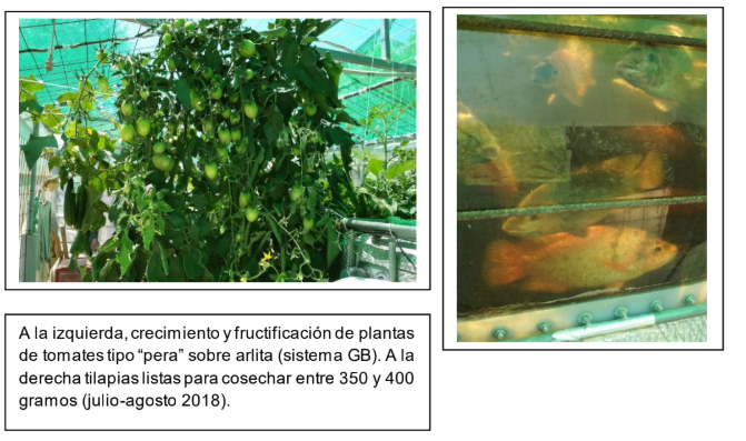 diferentes entre especies y variedades) y 33 Kg de tilapias; mientras que, en la otra, se alcanzaron los 174 Kg de hortalizas y 29 Kg de tilapias.